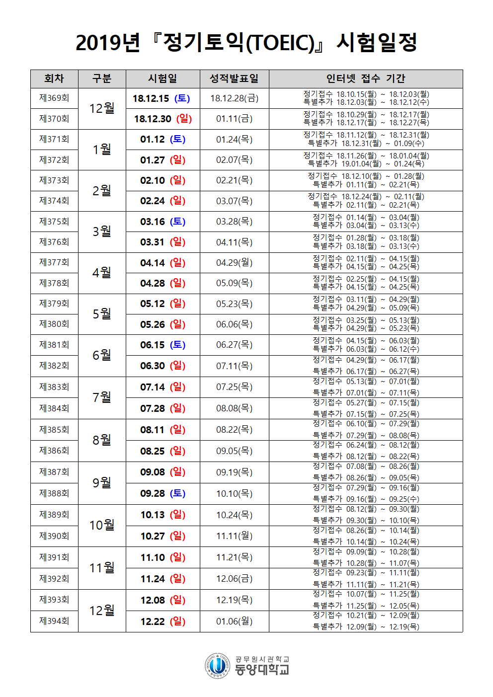 1. 2019년 정기토익(TOEIC) 시험일정001
