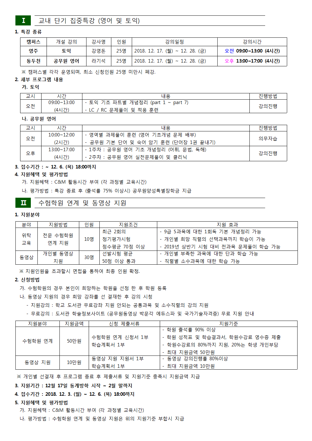동계방학 프로그램 세부 안내문 (교내특강 및 수험학원, 동영상지원)