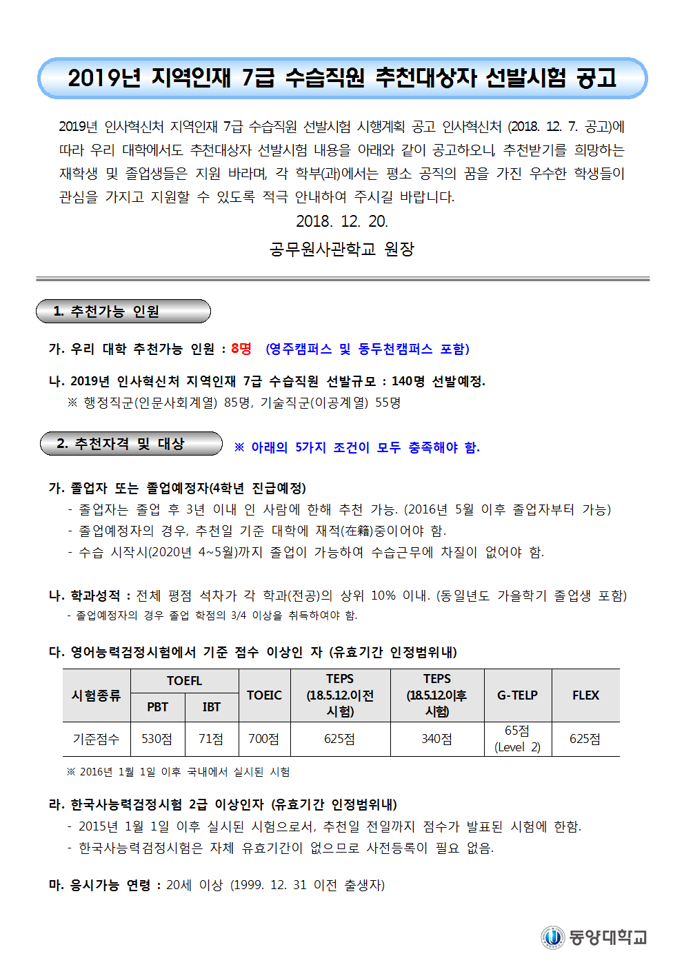 (동양대 공고문) 2019년도 지역인재 7급 수습직원 추천대상자 선발시험 공고001