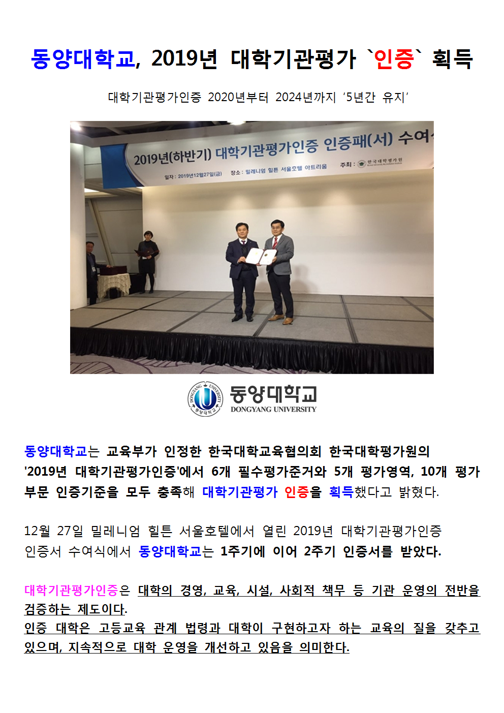 동양대, 2019년 대학기관평가 `인증` 획득001