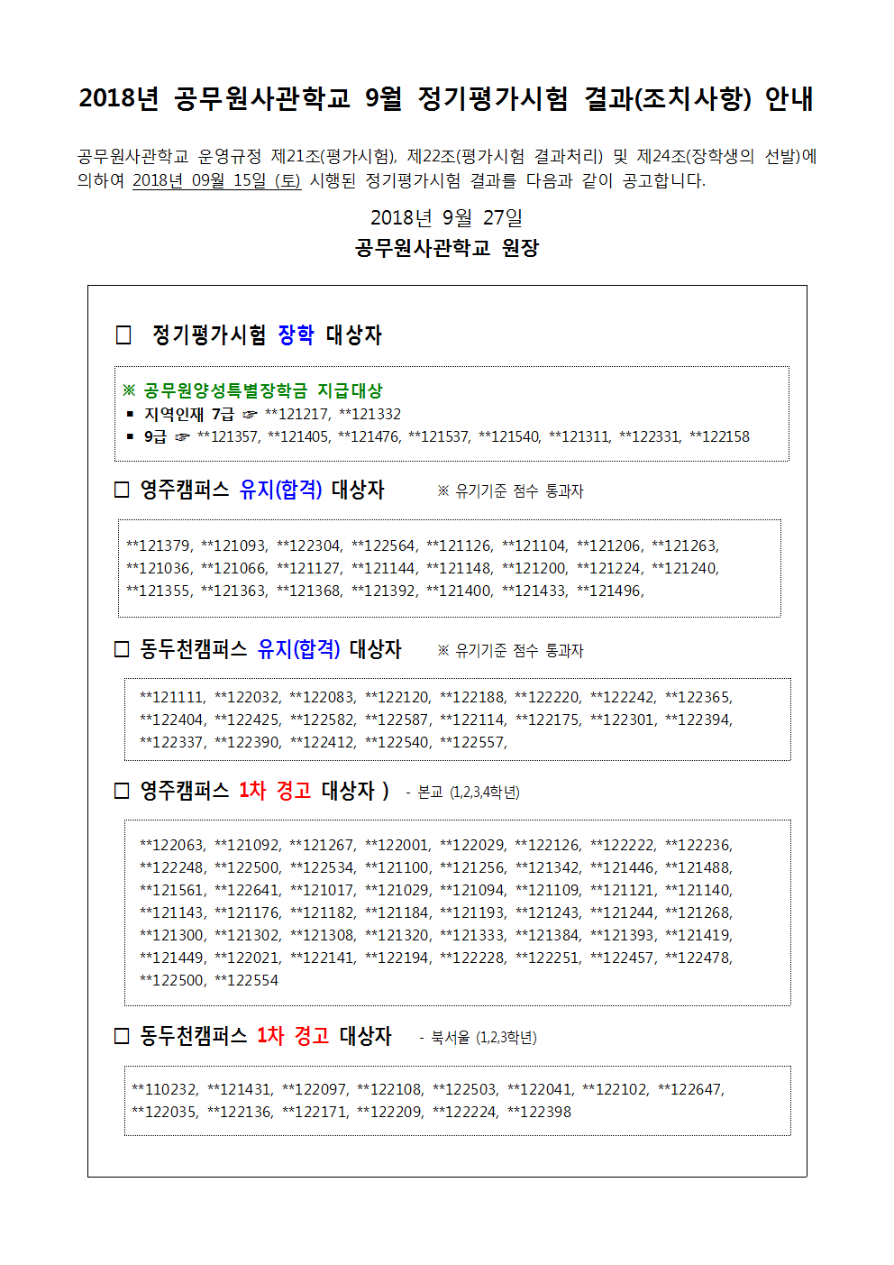 붙임1) 2018학년도 공무원사관학교 9월 정기평가시험 결과(조치사항) 안내 (공지용)001