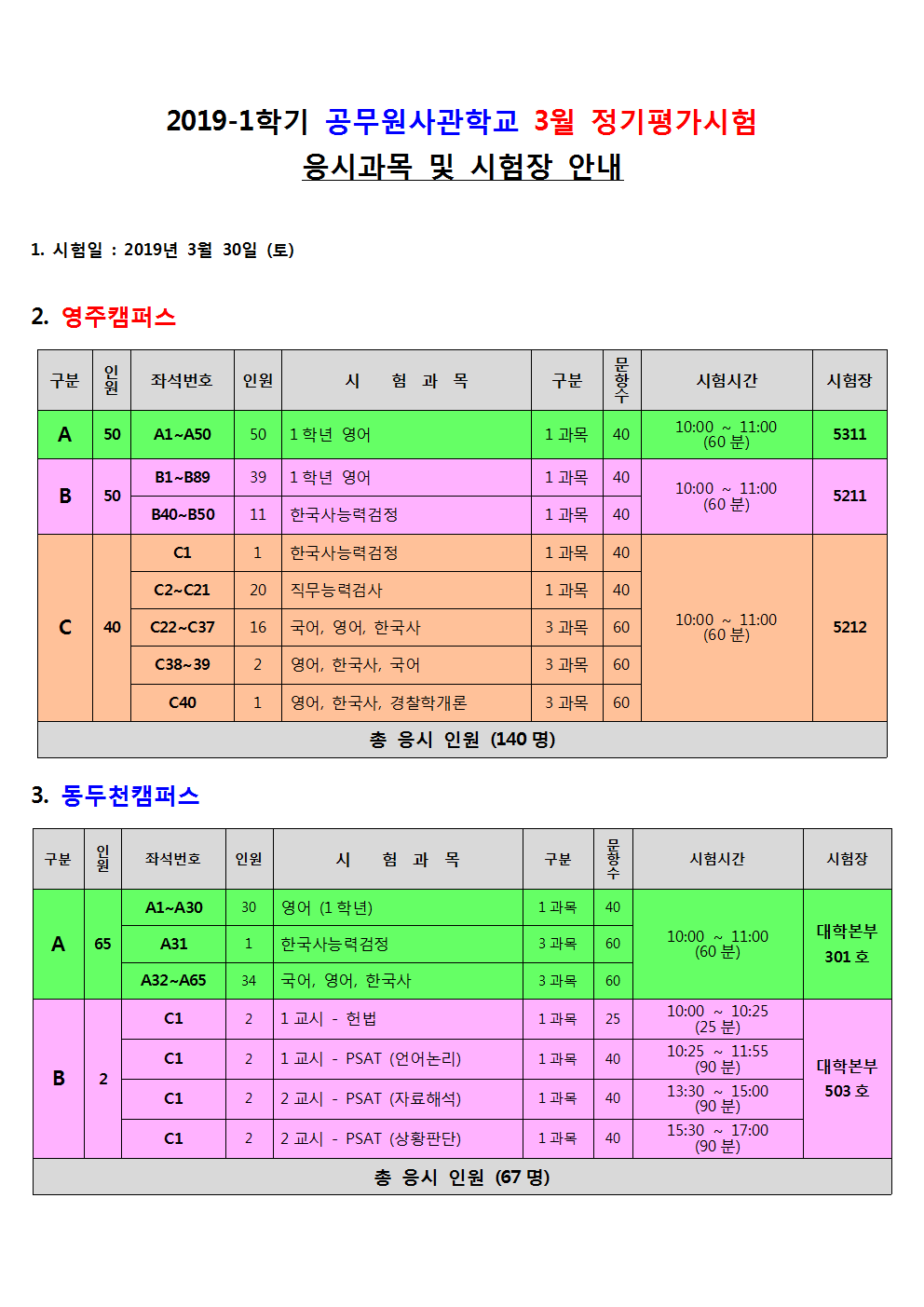 붙임3) 2019-1학기 공무원사관학교 3월 정기평가시험 응시과목 및 시험장 안내001