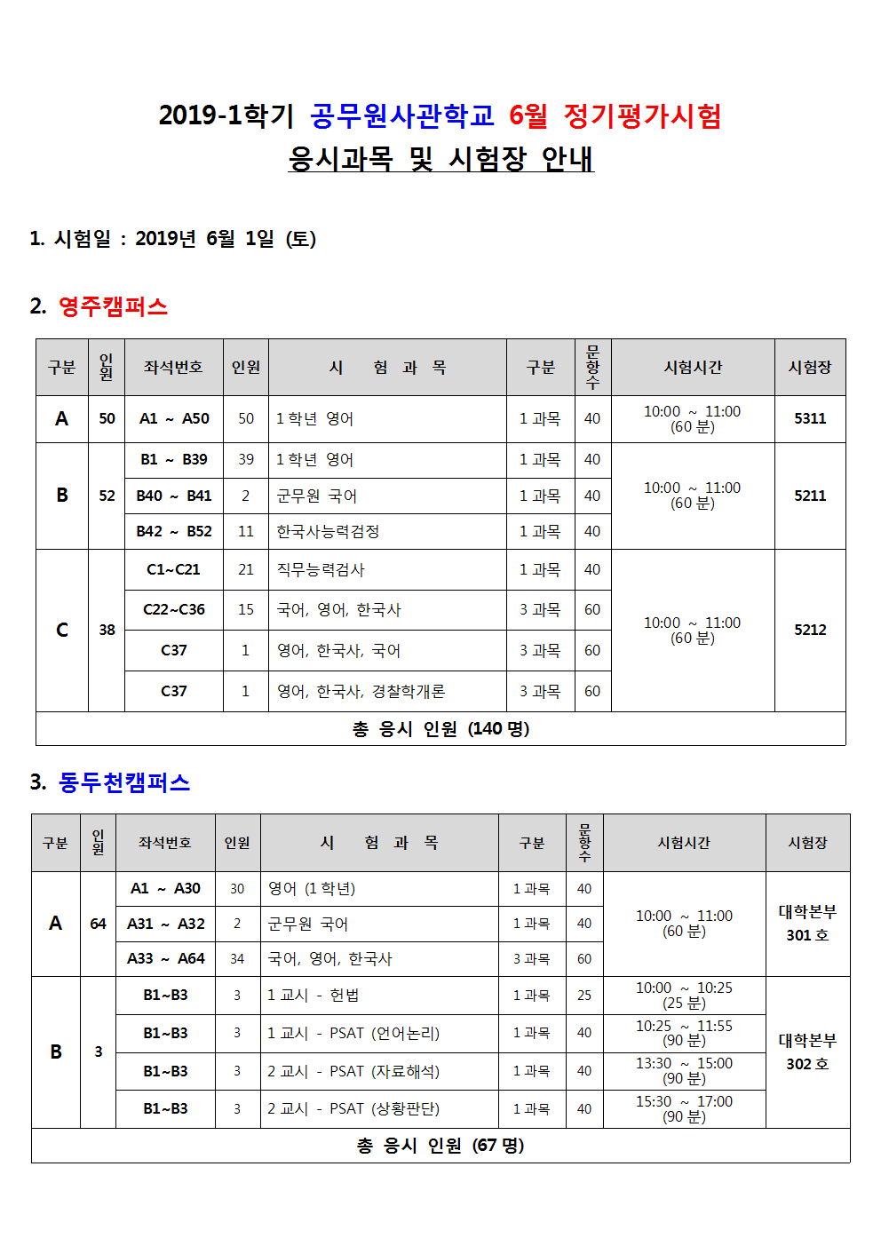 붙임3) 2019-1학기 공무원사관학교 6월 정기평가시험 응시과목 및 시험장 안내