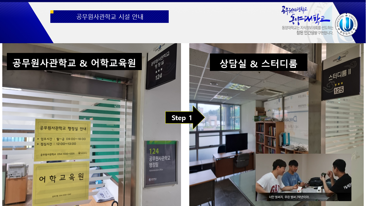 연락처 : 영주 ☎ 054)630-1225, 동두천 ☎ 031)839-9040   위치 : (영주) 경북 영주시 풍기읍 동양대로 145 공무원사관학교(H동), (동두천) 경기도 동두천시 평화로 2741 학생지원센터