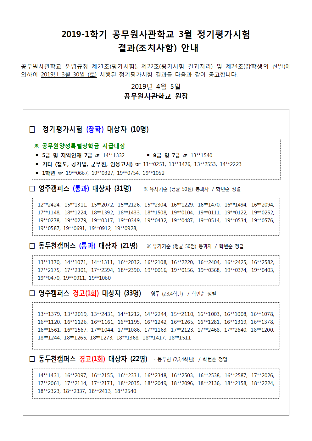 (홈페이지 공지) 2019-1학기 공무원사관학교 3월 정기평가시험 결과(조치사항) 안내 001