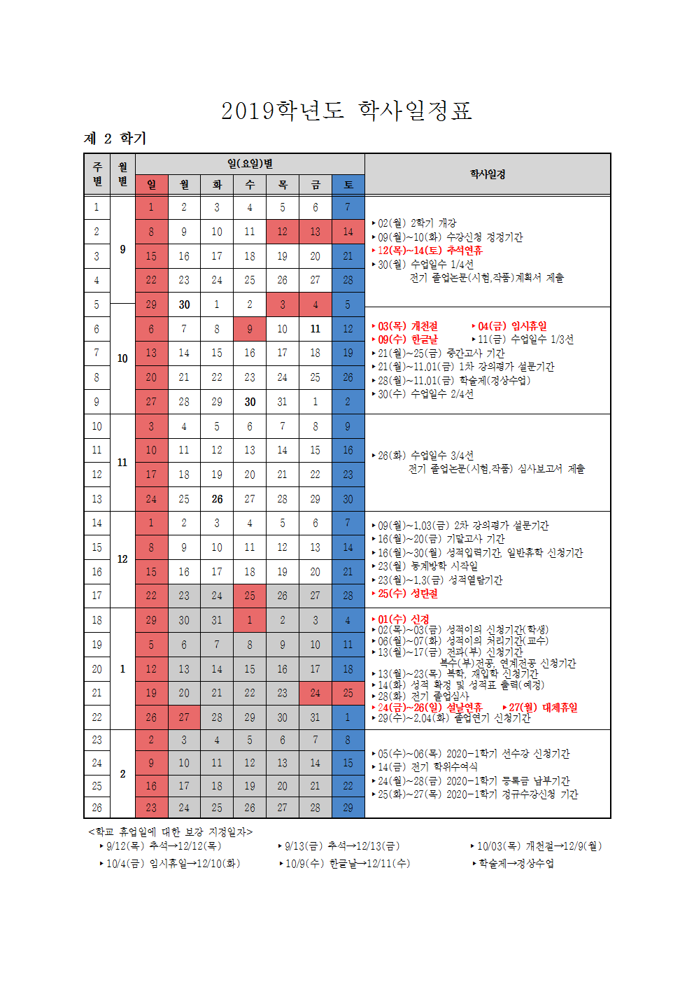 2019학년도 동양대학교 학사일정표 (교무지원팀)002
