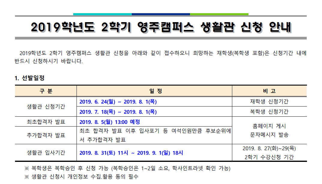 2019-2학기 영주캠퍼스 생활관 신청안내