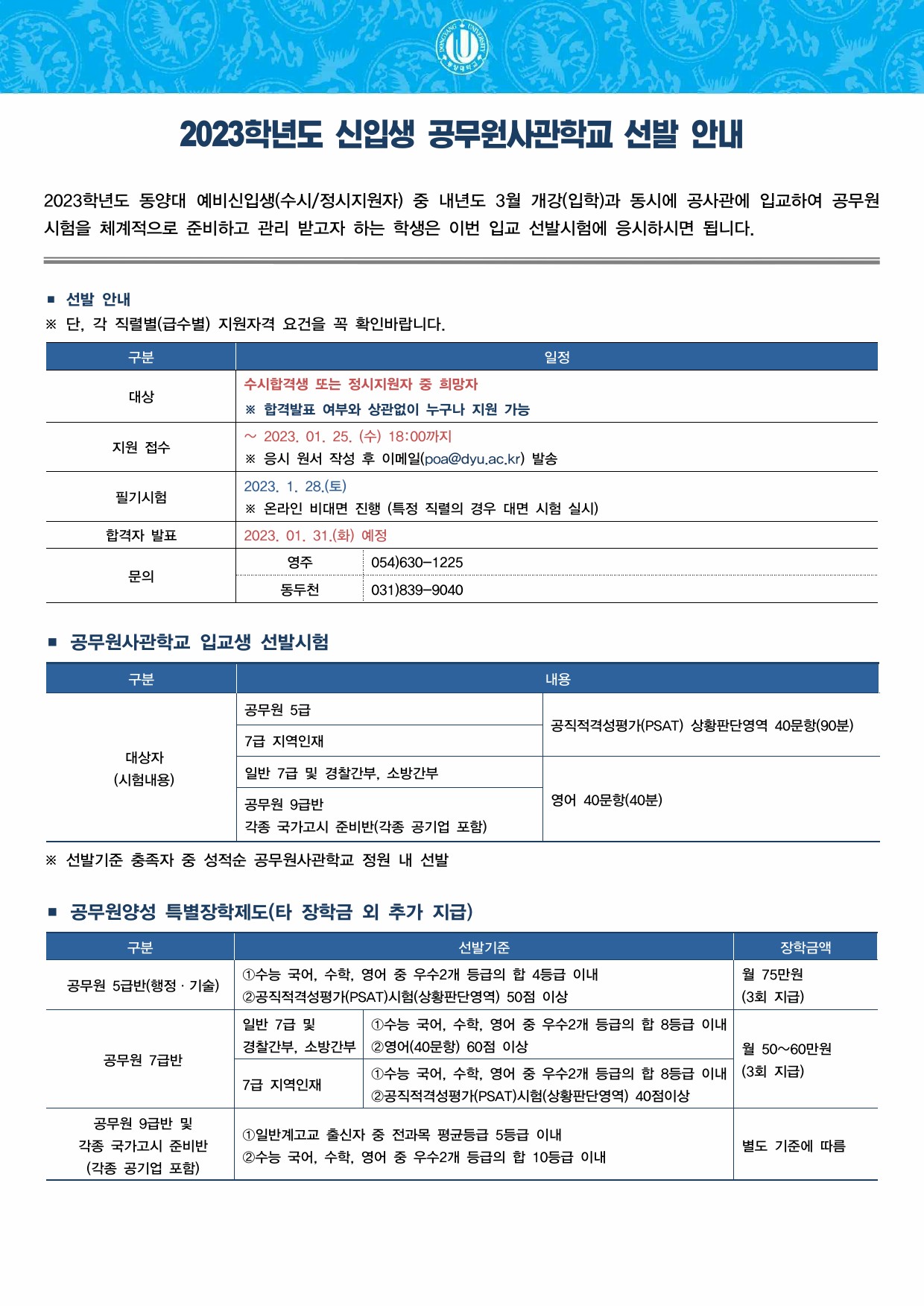 연락처 : 영주 ☎ 054)630-1225, 동두천 ☎ 031)839-9040   위치 : (영주) 경북 영주시 풍기읍 동양대로 145 공무원사관학교(H동), (동두천) 경기도 동두천시 평화로 2741 학생지원센터