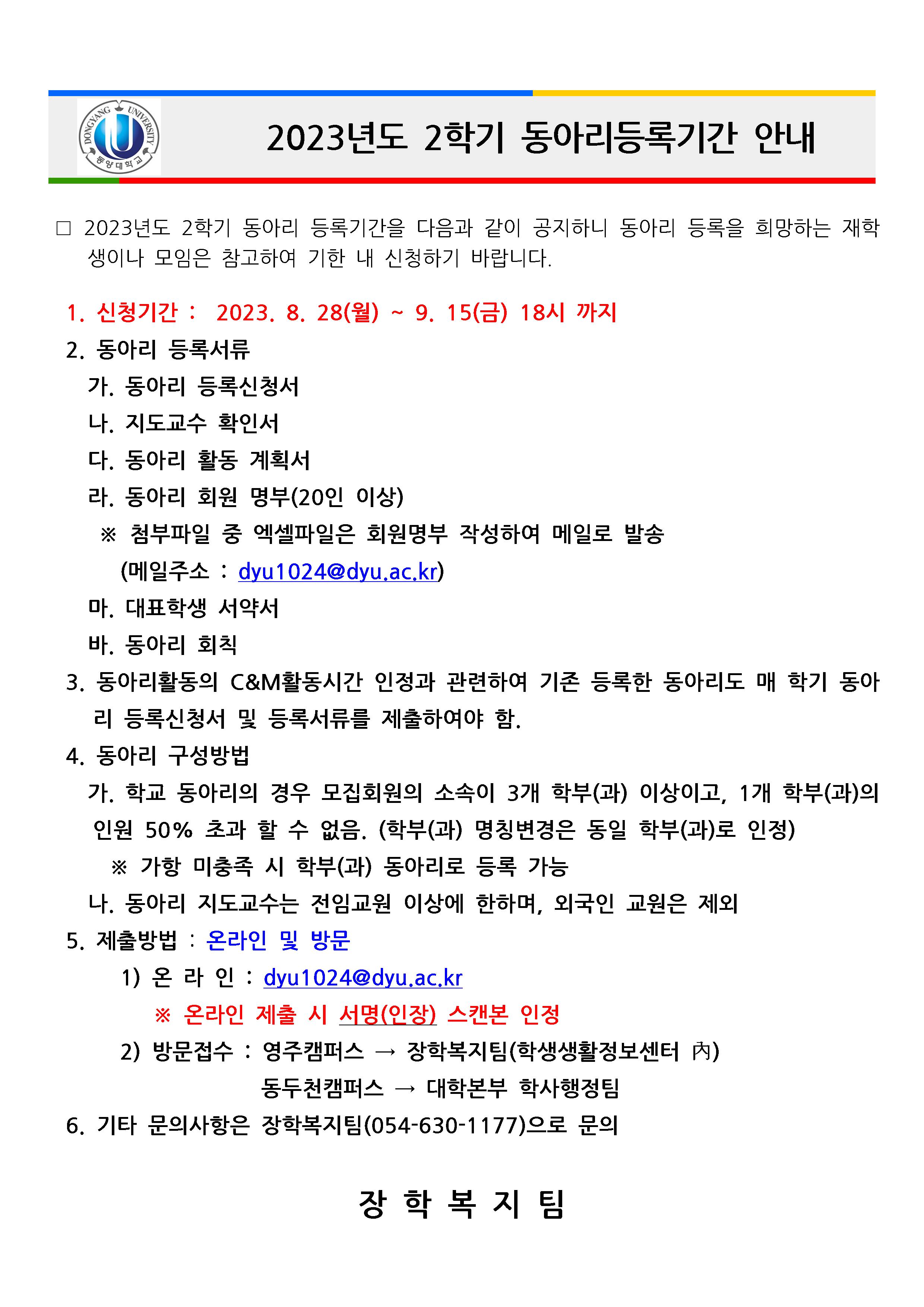 2023년도 2학기 동아리 등록기간 안내(본문내용)