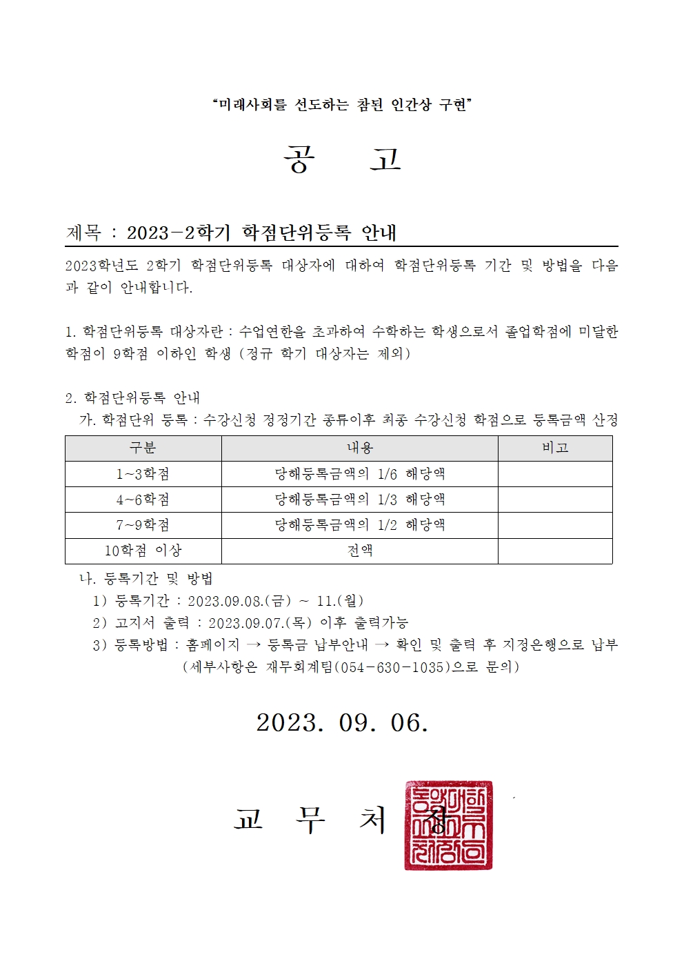 2023-2학기 학점단위 등록 안내