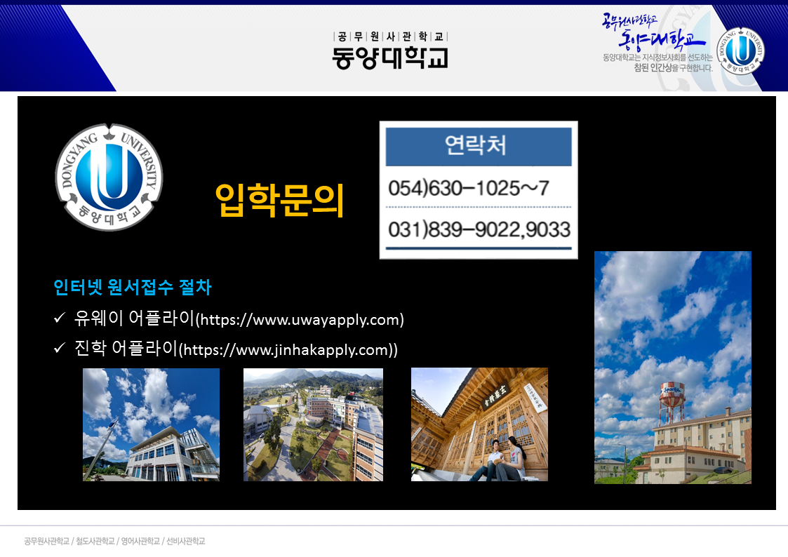 연락처 : 영주 ☎ 054)630-1225, 동두천 ☎ 031)839-9040   위치 : (영주) 경북 영주시 풍기읍 동양대로 145 공무원사관학교(H동), (동두천) 경기도 동두천시 평화로 2741 학생지원센터