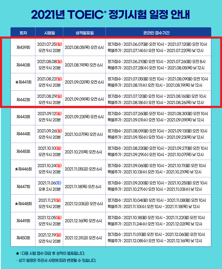 2021년 정기토익 시험일정 (7월, 8월)