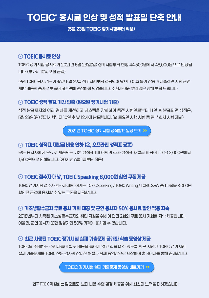 TOEIC 응시료 인상 및 성적 발표일 단축 안내